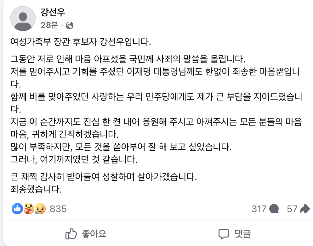 강 후보자는 "많이 부족하지만, 모든 것을 쏟아부어 잘해 보고 싶었다. 그러나 여기까지였던 것 같다"며 아쉬움을 토로했습니다. 그러면서 "큰 채찍 감사히 받아들여 성찰하며 살아가겠다. 죄송했다"고 덧붙이며, 이번 사태에 대한 책임을 통감하는 모습을 보였습니다.